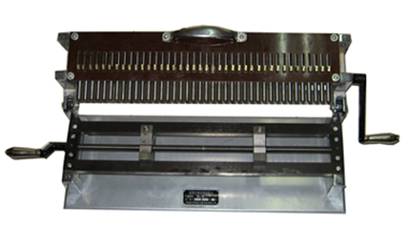 該設(shè)備是通過一根具有螺旋帶的軸旋轉(zhuǎn)360°,在不同角度順序抬起沖頭,并借助彈簧的彈力順序沖擊打點。手柄搖動一周即可在樣坯上打出直線排列間距為10mm或5mm,總長400mm的準(zhǔn)確試樣。