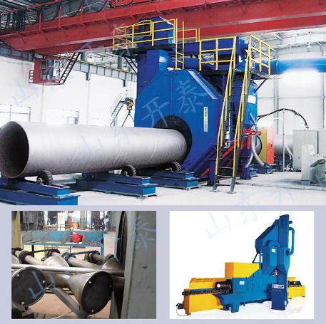 3、直徑大于500mm的鋼管,采用拋丸處理。利用鋼管內(nèi)壁專用拋丸器(具有液壓馬達(dá)驅(qū)動(dòng)、長(zhǎng)線輸丸桿彈丸輸送),實(shí)現(xiàn)了拋丸器支撐工位自適應(yīng),拋打工位自調(diào)整等功能